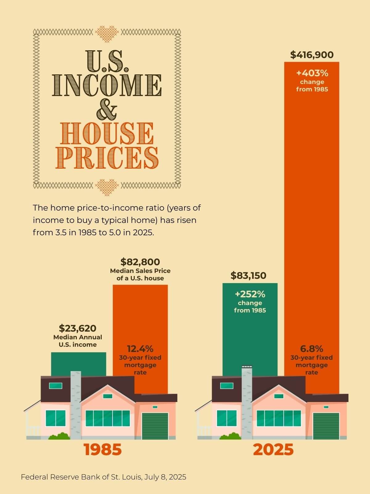 As the accompanying chart illustrates, in 2025, the median American home costs $416,900, versus the median annual household income of $83,150.2